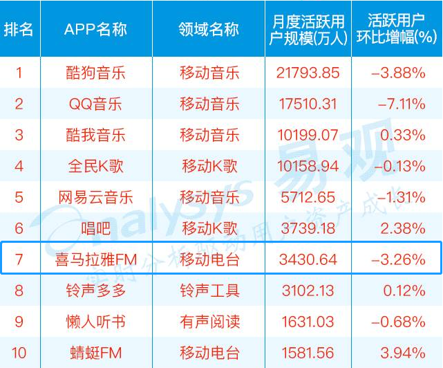 易观千帆根据2017年7月统计的数据显示,在音频娱乐APP中,喜马拉雅以超3430万月活用户排名榜单第七。而在移动电台类APP排名中,喜马拉雅则以绝对优势排名第一。