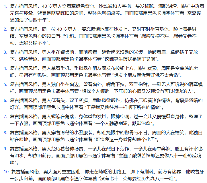 第二步:生成画面提示词根据这个人物形象和文案,写出AI绘图提示词,要求为复古插画风格,语录每句话对应一组提示词,一共10组提示词,每一组绘画提示词要保持人物风格一致,每组提示词末尾加上“画面顶部用黑色卡通字体写着“XXX”。”,其中XXX用语录内容来代替 人物:一个穿着军绿色背心、沙滩裤,人字拖的40岁男人,头发稀疏,满脸胡渣,忧心忡忡的样子。 视频文案:窝窝囊囊的活了快四十年,想摆又摆不烂,想卷又卷不动,想躺又躺不平。这碗夹生饭我是咽了又咽,想发个朋友圈诉苦好像不太合适,想找个人倾诉一下压抑的心情又发现没有可以倾诉的人。于是我又像往常一样咽下所有的情绪,一个人静静崩溃,默默治愈。可怜我这一身傲骨却像个小丑,尝遍了酸甜苦辣却还要像八十一难苟延残喘,没有七十二变却要经历九九八十一难。