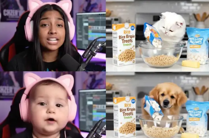 输入指令:”make the woman young, like a baby“(让女性变年轻,像婴儿) 结果:画面中的成年女性瞬间变成了婴儿形象,面部特征自然过渡,毫无PS痕迹。一个普通的直播片段转眼成了 ”AI宝宝播客“ 视频。