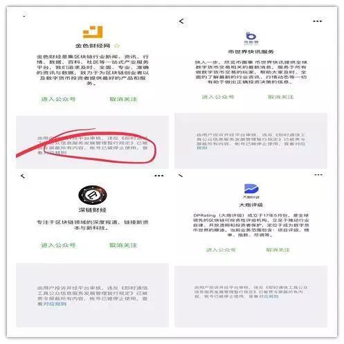 不过,多个被停止使用的区块链自媒体微信公众号中,其相关连的网站、APP、小程序等目前都在正常运营,也有自媒体的转世号(即小号)出现。