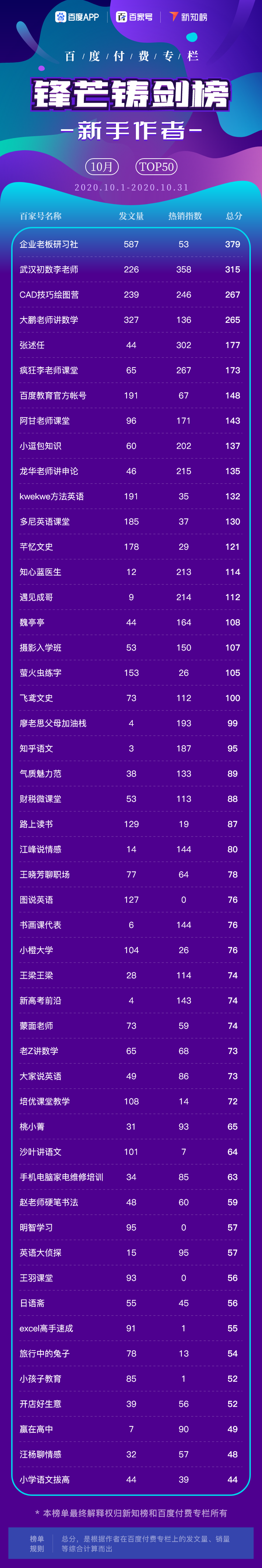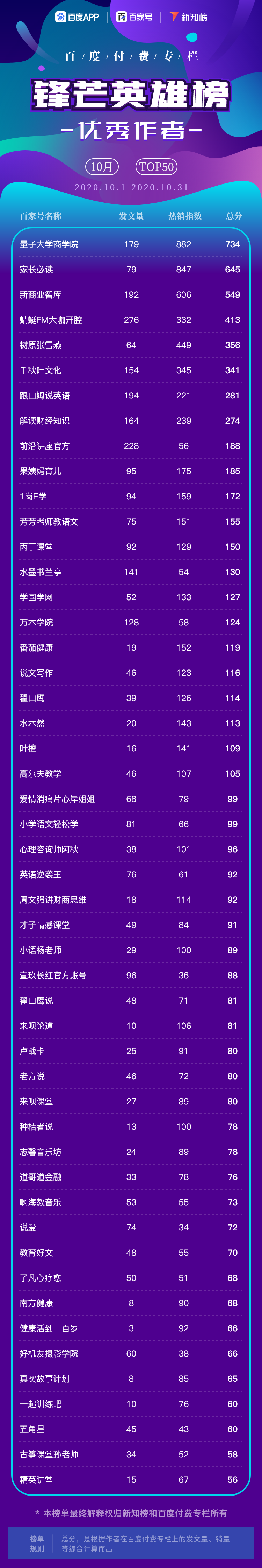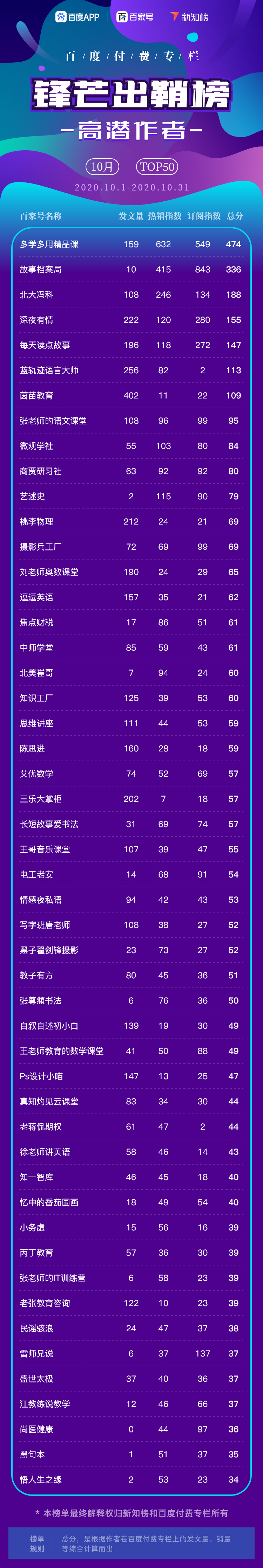 百度付费专栏和新知榜联合发布10月百家号付费作者榜单: