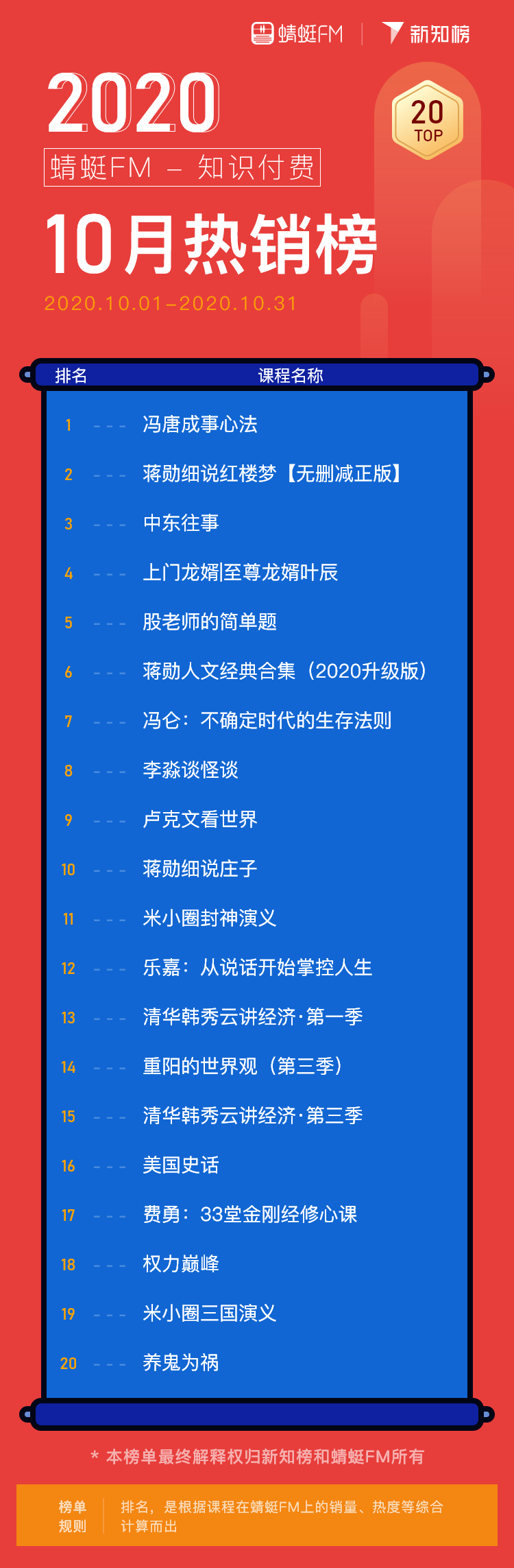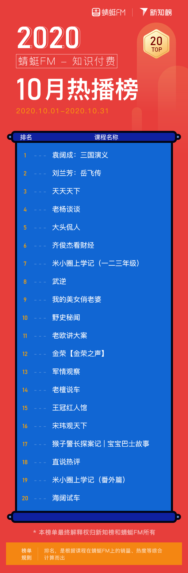 蜻蜓FM与新知榜联合发布10月榜单,老梁继续发力,不仅《老梁通史》成为了会员榜冠军,《老梁的四大名著情商课》也成功跻身会员榜前四。