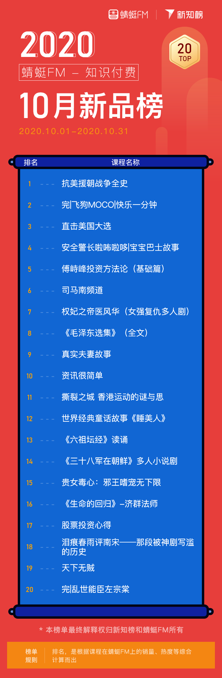 关注蜻蜓FM和新知榜每月推出的联合榜单,这里有最流行的用户喜好和消费趋势,有最优质的名人主播和电台节目。蜻蜓FM,更多的世界,用听的!