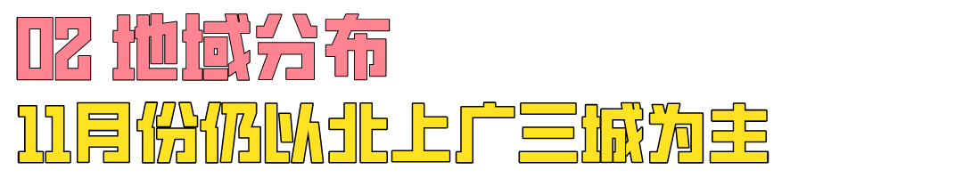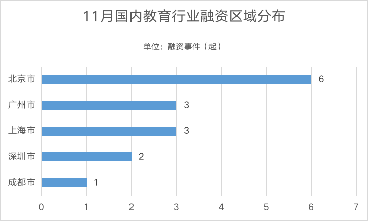 从获投项目所在的区域分布来看,整个11月份融资地域分布仍以北上广三城为主,与10月基本一致。但融资地域从11月的7个城市减少到5个。北京以6家企业融资领先,广州和上海各发生3起,深圳2起,成都1起。
