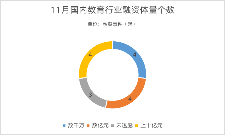 11月融资事件细分领域中,K12以4起的数量位居榜首,语言培训以3起的数量屈居第二,早幼教、少儿编程、职业教育以各2起并列第三。此外,体育教育和升学咨询具有融资发生。