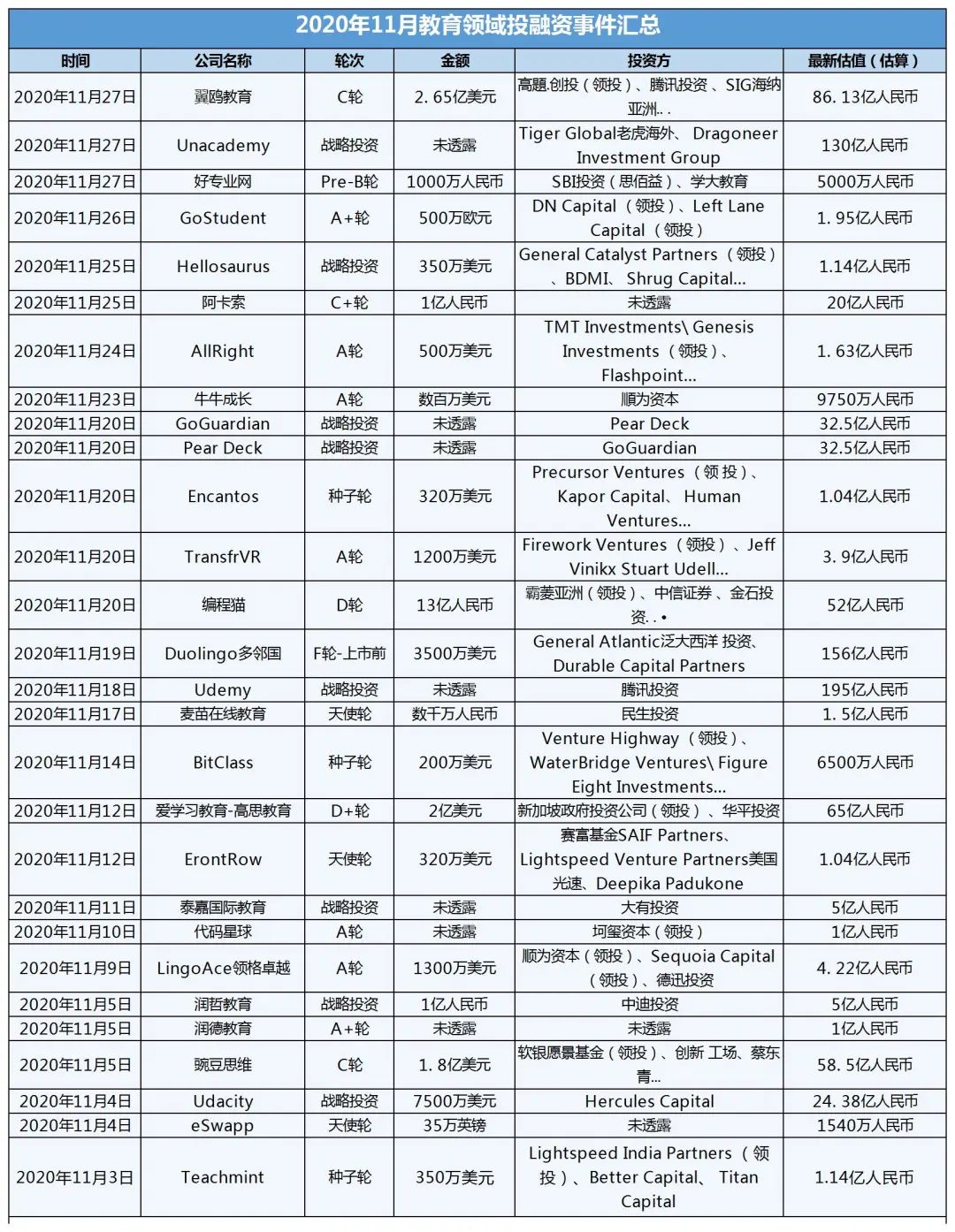 翼鸥教育、爱学习教育-高思教育、豌豆思维投融资金额为数亿美元。阿卡索、编程猫、润哲教育投融资金额为数亿人民币。