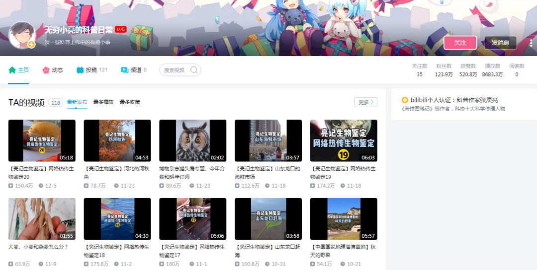 微博大V博物君 @无穷小亮的科普日常,中科院B站分身 @二次元的中科院物理所等等,在B站知识区,用户更坚信名人名校名师。