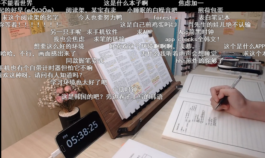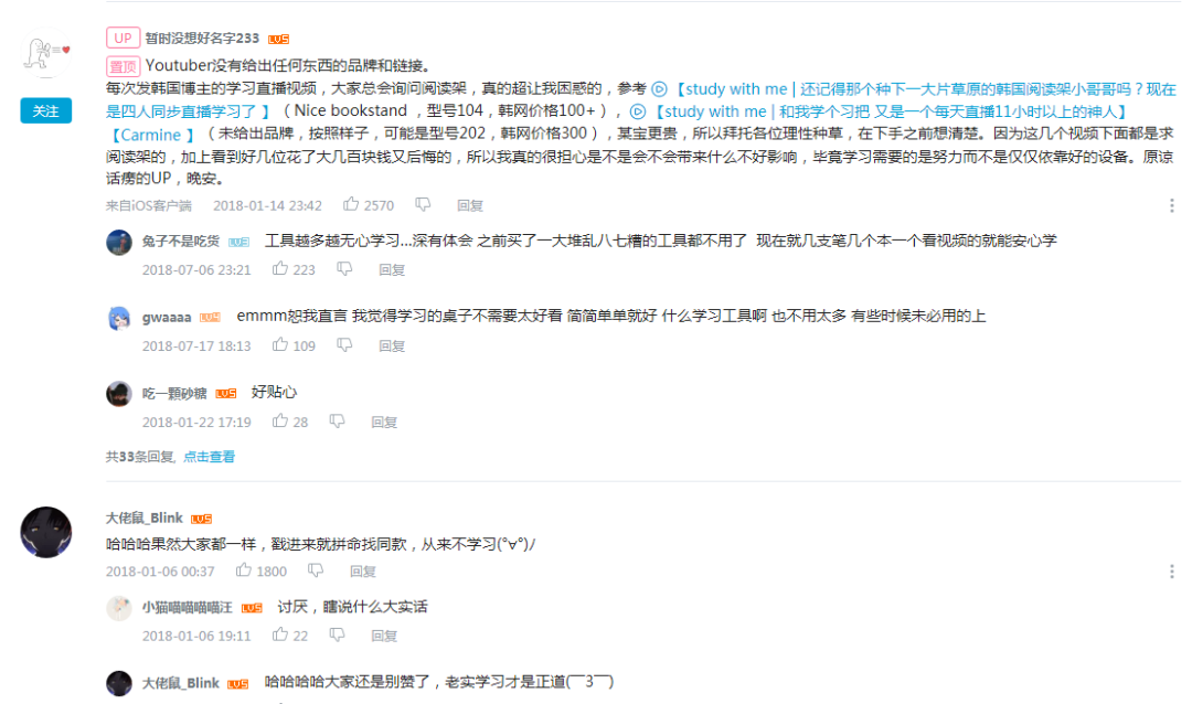以一条131.7万播放量、弹幕数1.3万、长达5小时07分59秒的学习直播视频为例,弹幕里满屏刷着学习flag、表白作者,热评却是种草和找同款,讨论学习内容少之又少。