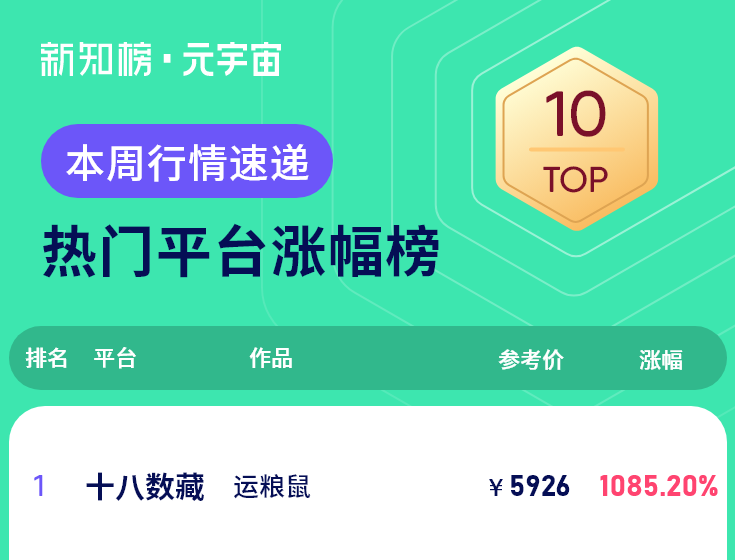 从本周起,新知榜元宇宙将为广大玩家带来“每周行情速递”,聚焦全行业热门平台的藏品涨跌情况进行数据输出,助力玩家更加直观地了解时下热门平台、热门藏品的最新涨跌趋势。以下是涨跌榜的具体情况:在热门平台涨幅榜上,涨幅最多的藏品来自十八数藏的运粮鼠,首发价1元,刚上线交易时500元左右,之后一路猛涨,最新价