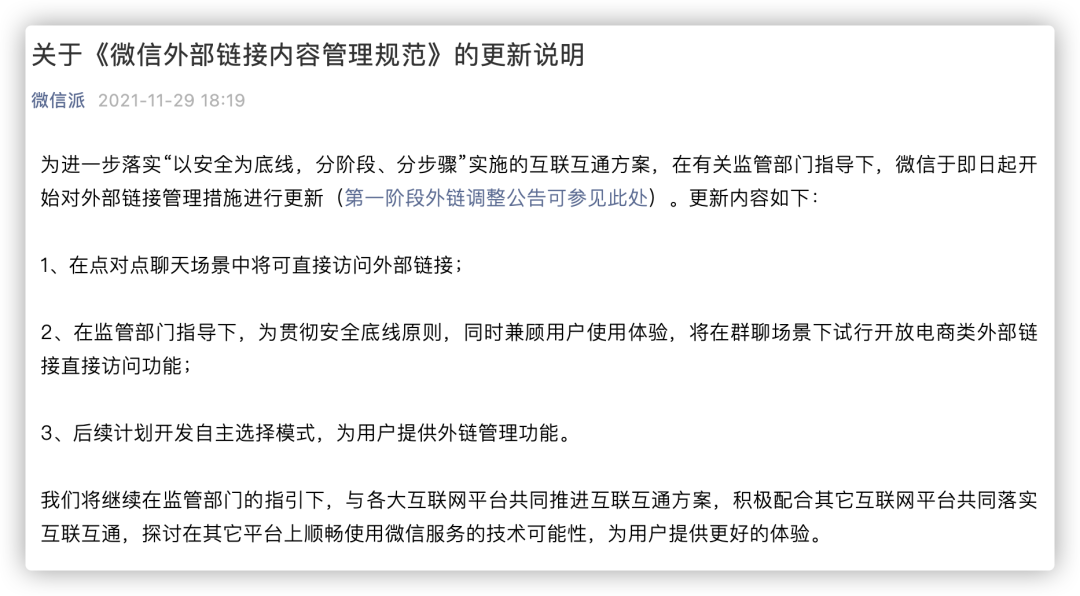 巨头之间的“互联互通”有了新进展。11月29日,微信更新了《微信外部链接内容管理规范》,宣布在点对点聊天中直接开放访问外部链接,并在群聊下试行开放电商外部链接。这是继9月17日发布“关于《微信外部链接内容管理规范》调整的声明”后,微信在开启“互联互通”上的新动作。在上一个版本中,微信开放了一对一聊天