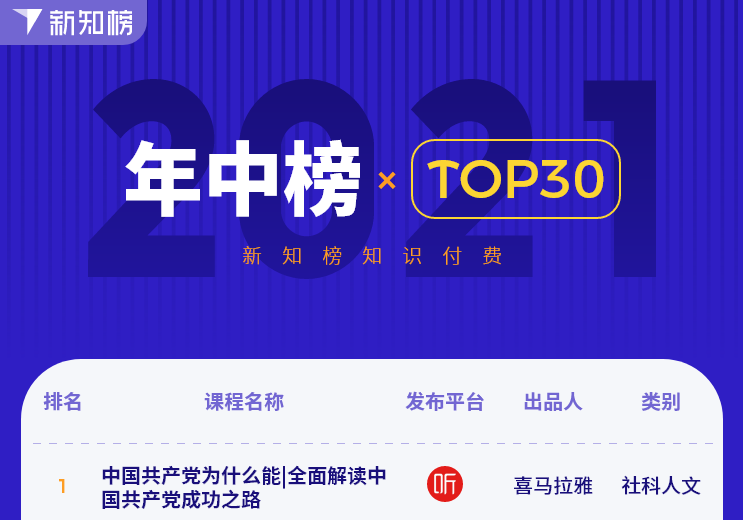 转眼间,2021年已经过去一半,新知榜知识付费排行榜上的课程愈加丰富多元,除了纯知识课程外,广播剧、有声剧频出新作,数档播客节目也在上半年脱颖而出。那么,上半年具体有哪些优秀课程呢?为此,我们发布了新知榜知识付费2021年中榜单,为你揭晓“新知榜知识付费2021年中榜TOP30”、“社科人文榜TOP