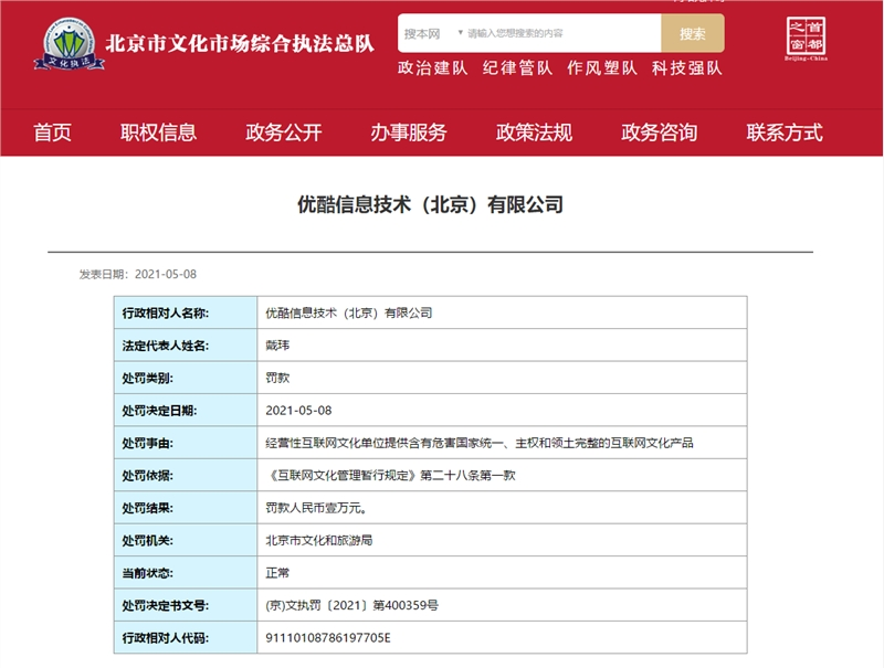 据北京文旅局网站显示,优酷信息技术(北京)有限公司被罚1万元。罚单显示,北京文旅局对优酷的处罚事由为:经营性互联网文化单位提供含有危害国家统一、主权和领土完整的互联网文化产品。该行为违反了《互联网文化管理暂行规定》第二十八条第一款。 据了解,《互联网文化管理暂行规定》第二十八条第一款规定,