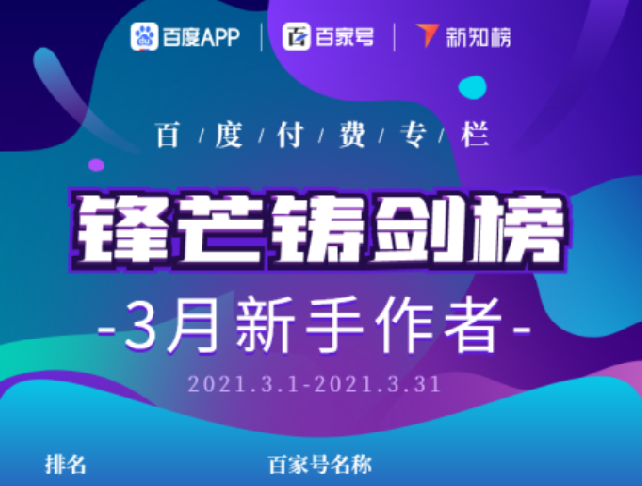 今日,新知榜联合百度付费专栏最新发布3月作者榜单,本期共发布锋芒铸剑榜(新手作者),锋芒出鞘榜(潜力作者),锋芒英雄榜(优秀作者)三个榜单,共有18位付费专栏作者登榜,排名根据作者当月发布章节数及GMV数据综合评定而出。其中“才子情感课堂”登顶锋芒铸剑榜榜首;“两性心语录”斩获锋芒出鞘榜TOP1;而