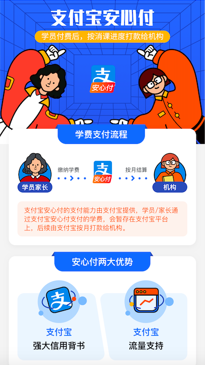 近日,教育信息化综合服务提供商校宝在线,宣布联合数字生活开放平台支付宝推出“学费码安心付”。“学费码安心付”类似学费担保交易模式,其功能可概括为“学费存管,分批结算”。教育培训机构主动申请开通后,若学员报名时通过“学费码安心付”交费,资金将暂存在支付宝学费码安心付平台,然后按照教学进度,由平台分期支