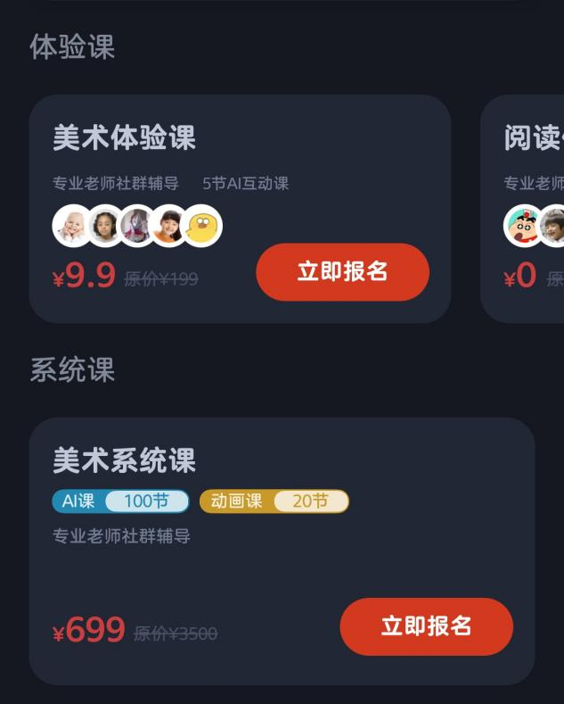 近日,小狸AI课宣布正式研发了适合3~8岁儿童线上学习的AI美术课。此次AI美术课还推出了9块9的体验课,包括4节AI美术课+1节AR·3D绘画课,并赠送配套的画材教具,在课程上,小狸AI美术课采用的 “四步驱动法”,将20分钟的课程科学切分为4个部分,循序渐进。同样为体验课,但在语文、思想、英语的