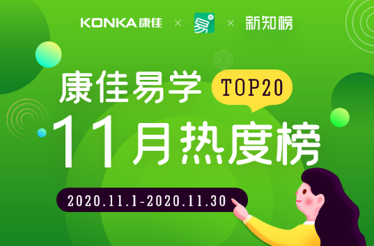 康佳易学11月知识课程TOP20榜单发布了:1、义方教育的《动画识字》夺得榜单热度冠军;2、读书郎的《人教版语文1年级上册》表现稳定,成为11月榜单亚军;3、三及第的《一年级语文专项·汉语拼音基础入门》闯入前三甲。随着越来越多优质课程入驻康佳易学,康佳易学将每月推出知识课程榜单,为大家带来最新的知识