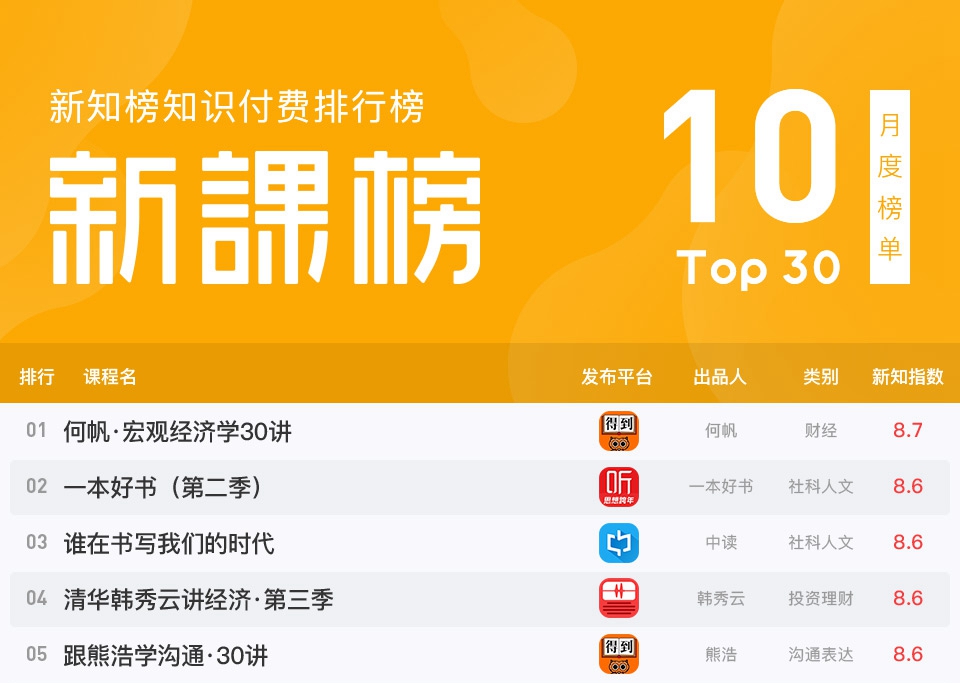 每月新课榜看的不过瘾,想要解锁更多精品课程?在收到大量反馈后,这一次,我们的新榜单真的来啦!本期新知榜,我们携手优酷新知推出“优酷新知知识付费9月热度排行榜TOP30”榜单,为你揭晓优酷新知9月最畅销的30个知识付费课程,而在10大分类的热度排行榜TOP10中,我们还将揭晓各类别中最受欢迎的10个精