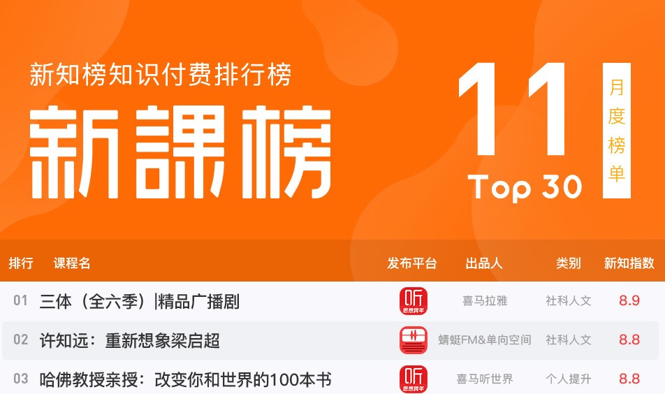新知榜知识付费11月新课榜出炉,喜马拉雅开启123狂欢节霸屏