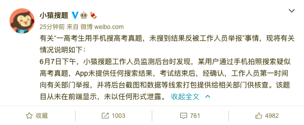 小猿搜题回应“高考生用手机搜题”:题目未泄露