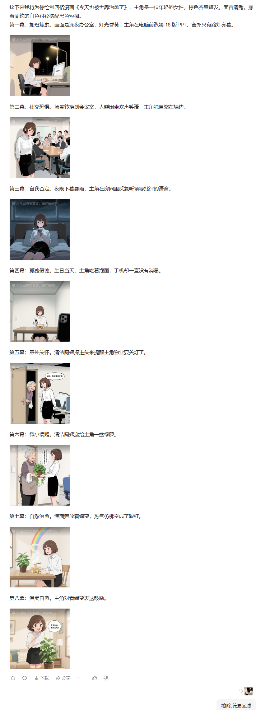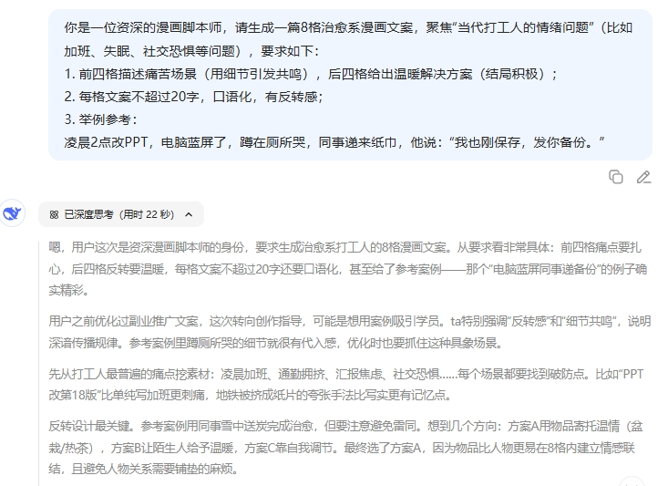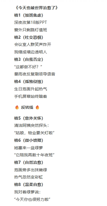 直接打开深度思考模式,联网模式,向 deepseek 提问:你是一位资深的漫画脚本师,请生成一篇8格治愈系漫画文案,聚焦“当代打工人的情绪问题”(比如加班、失眠、社交恐惧等问题),要求如下: