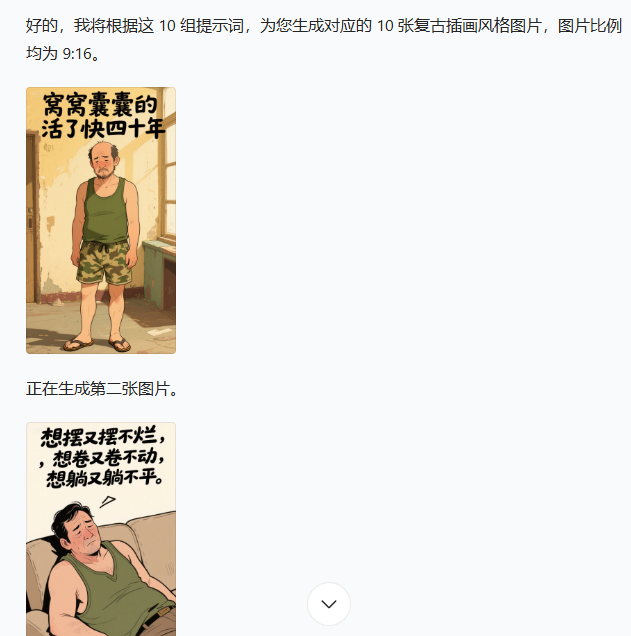 第三步:生成图片根据上面的10组提示词,生成对应的图片,图片比例为9:16;也可以复制提示词一个一个出图。 生成好后,把一个个图片都下载下来,后面剪辑视频用。